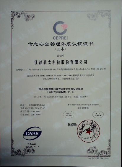 2014年3~4月,星空电竞科技顺利通过了国际标准及权威的ISO27001信息安全认证体系和ISO20000信息技术服务管理体系,取得了广州赛宝认证中心颁发的ISO/IEC 27001:2005信息安全管理体系认证证书和ISO/IEC 20000-1:2011信息技术服务管理体系认证证书。